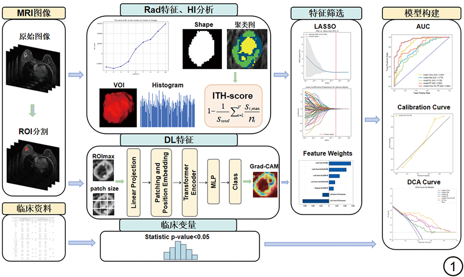 MRI检查为评估乳腺癌患者NAC疗效的最佳成像方法[6, 7]。近年来,基于MRI传统影像组学特征实现了非侵入性预测NAC疗效,但其对肿瘤复杂高维空间异质性的表征效果有限[8, 9];基于视觉转换器(vision transformer, ViT)的深度学习(deep learning, DL)模型凭借其自注意力机制,可有效捕获肿瘤全域空间的动态交互关系,挖掘深层语义特征,但现有DL方法常将肿瘤视为均质整体输入,难以充分表征其内在空间异质性[10, 11]。生境成像(habitat imaging, HI)通过划分不同肿瘤亚区,将局部组学特征与全局像素分布信息相结合,为ITH的定量评估提供了新途径[12, 13]。然而,当前生境研究多侧重于单模态生境特征提取与定性描述,对ITH量化分析仍显不足,同时缺乏与DL模型的系统性融合研究,导致其生物学可解释性与临床转化价值受限。本研究创新性地构建了基于治疗前MRI生境异质性定量及DL的多模态分层融合预测框架,通过对比单一模型与联合模型的效能差异,旨在为乳腺癌NAC后pCR的个体化预测提供一种兼具生物学可解释性与临床实用性的新策略。