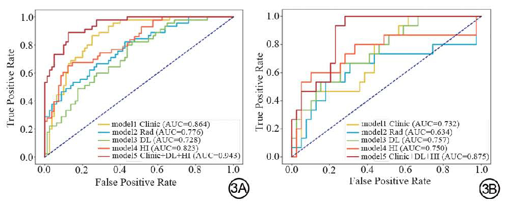 图3  各模型ROC 曲线。3A:训练组;3B:验证组。ROC:受试者工作特征;Clinic:临床模型;Rad:影像组学模型;DL:深度学习模型;HI:生境影像组学模型;AUC:曲线下面积。