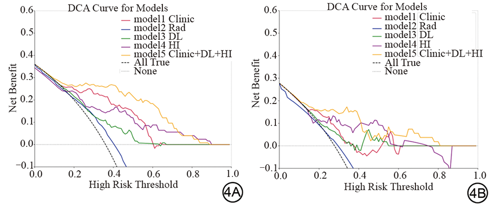 图4  各个模型预测乳腺癌患者NAC后疗效的决策曲线。4A:训练组;4B:验证组。NAC:新辅助化疗;DCA:决策曲线分析;Clinic:临床模型;Rad:影像组学模型;DL:深度学习模型;HI:生境影像组学模型。