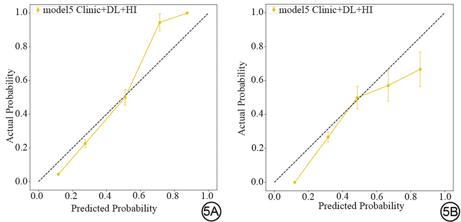 图5  HI联合模型的校准曲线。5A:训练组;5B:验证组。DL:深度学习;HI:生境成像。
