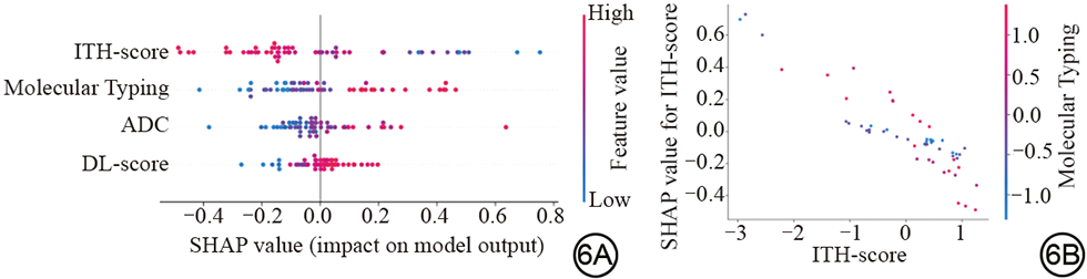 图6  HI联合模型的SHAP分析。6A:每个样本在不同特征下的SHAP值分布。6B:ITH-score与SHAP值的关联分析图。在SHAP图中,每个点代表一位患者,点的颜色由特征值大小决定,颜色由红到蓝表示特征值从大到小。同时,横轴上的SHAP值大小代表预测患者NAC达到pCR的可能性,SHAP值越大,预测结果越倾向于pCR,反之则倾向于Non-pCR。HI:生境成像;SHAP:Shapley Additive exPlanations;NAC:新辅助化疗;pCR:病理完全缓解;non-pCR:病理非完全缓解;ITH:肿瘤内异质性;ADC:表观扩散系数;DL:深度学习。