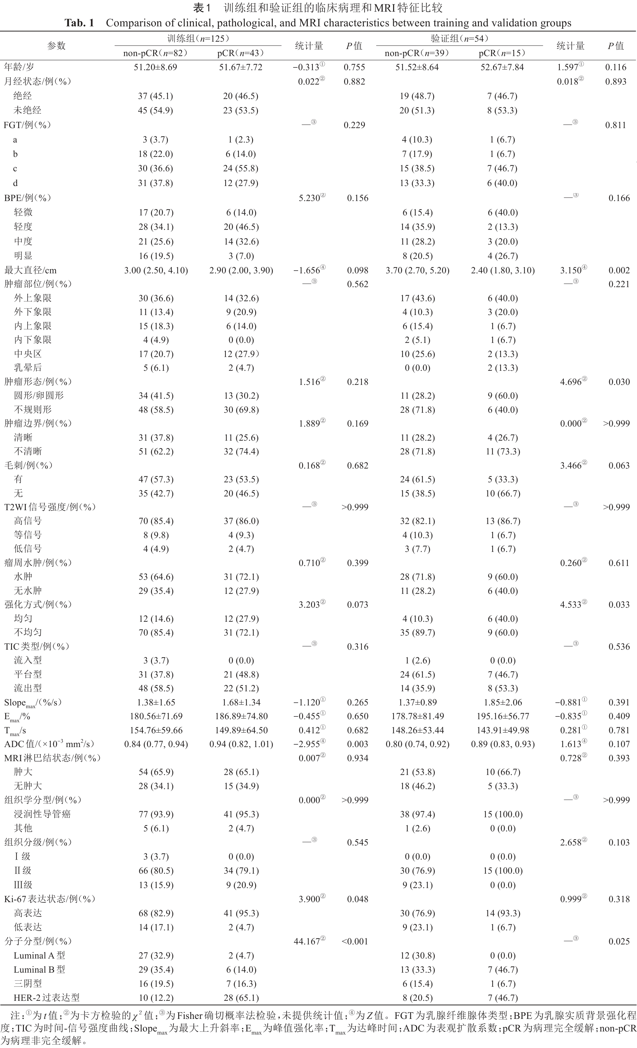 Tab. 1  Comparison of clinical, pathological, and MRI characteristics between training and validation groups