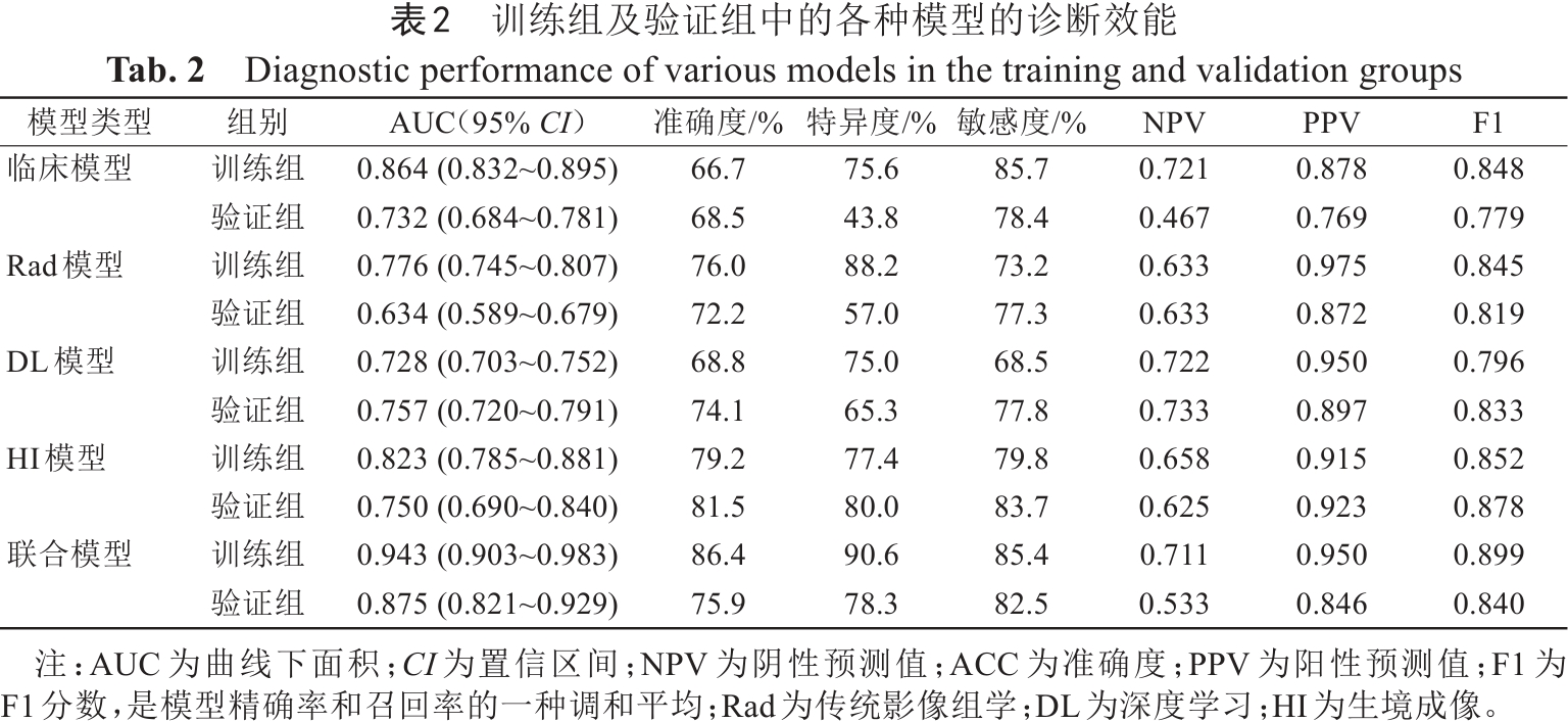 表2  训练组及验证组中的各种模型的诊断效能