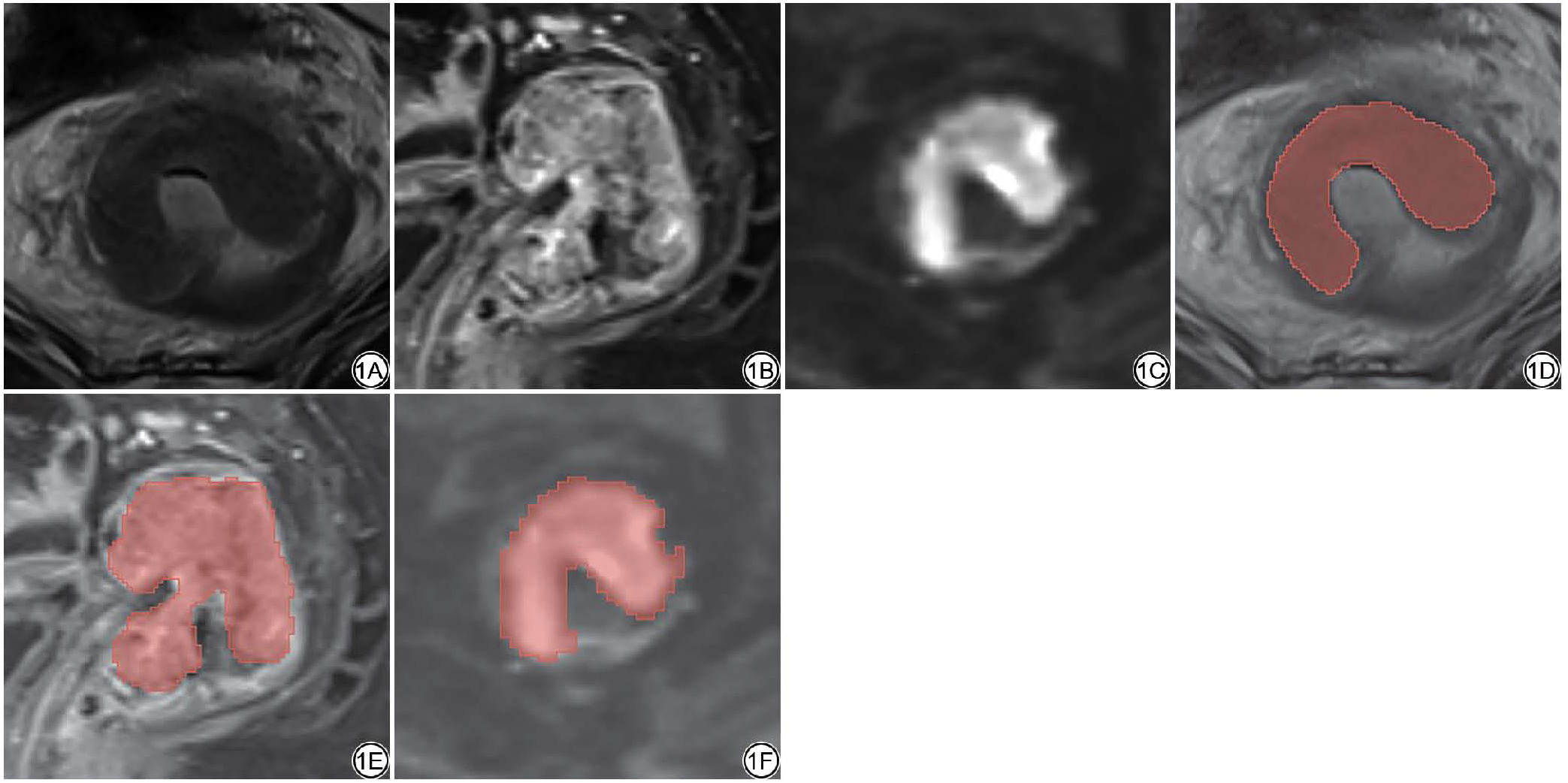 从电子病例系统中收集患者的临床基线特征,包括性别、年龄、癌胚抗原(carcinoembryonic antigen, CEA)水平、糖类抗原19-9(carbohydrate antigen 19-9, CA19-9)水平。MRI影像表型特征评估由两位分别具有8年及10年胃肠肿瘤诊断经验主治医师进行,并由另一位具有20年胃肠肿瘤诊断经验的副主任医师审核。收集并记录肿瘤的以下磁共振影像表型特征:肿瘤T分期、肿瘤N分期、肿瘤长径、肿瘤短径、肿瘤下缘距肛缘的距离(肿瘤位置)、直肠癌壁外血管侵犯(extra-mural vascular invasion, EMVI)、环周切缘(circum-ferential resection margin, CRM)等。