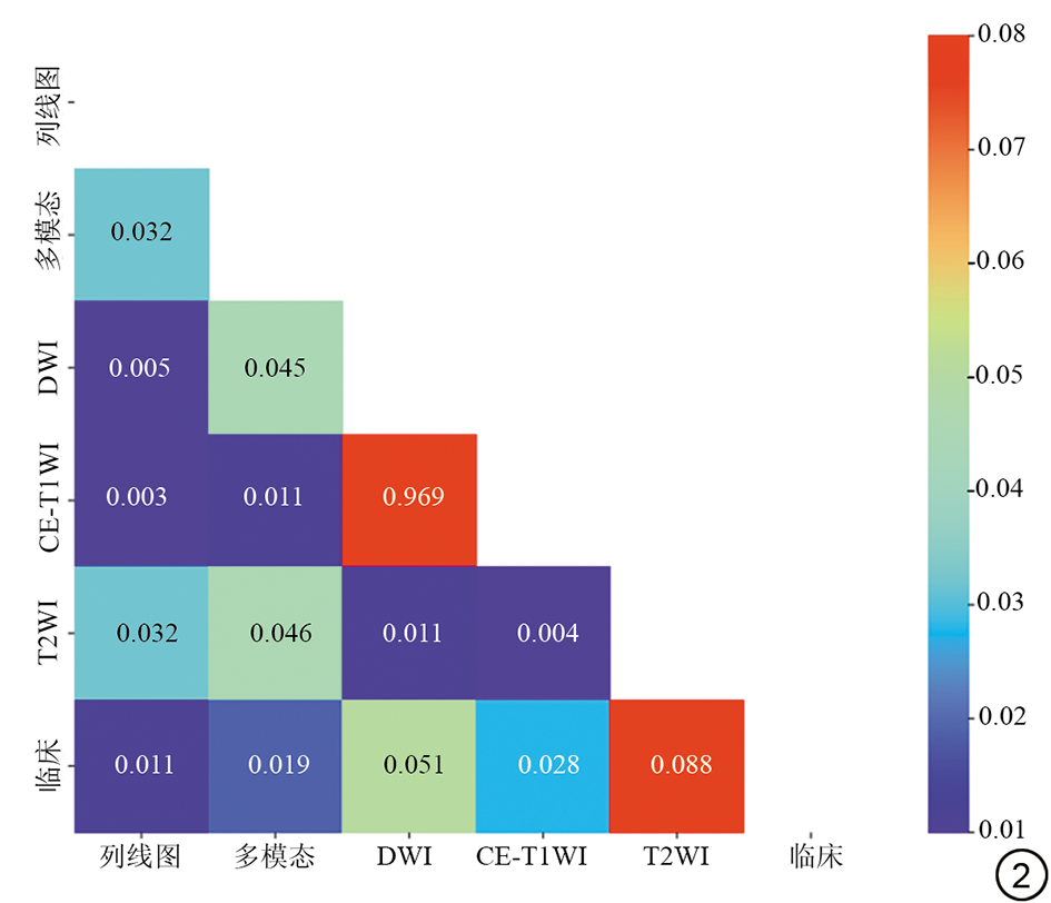 图2  各模型在训练集的DeLong检验结果。CE-T1WI:对比增强T1WI;DWI:弥散加权成像。