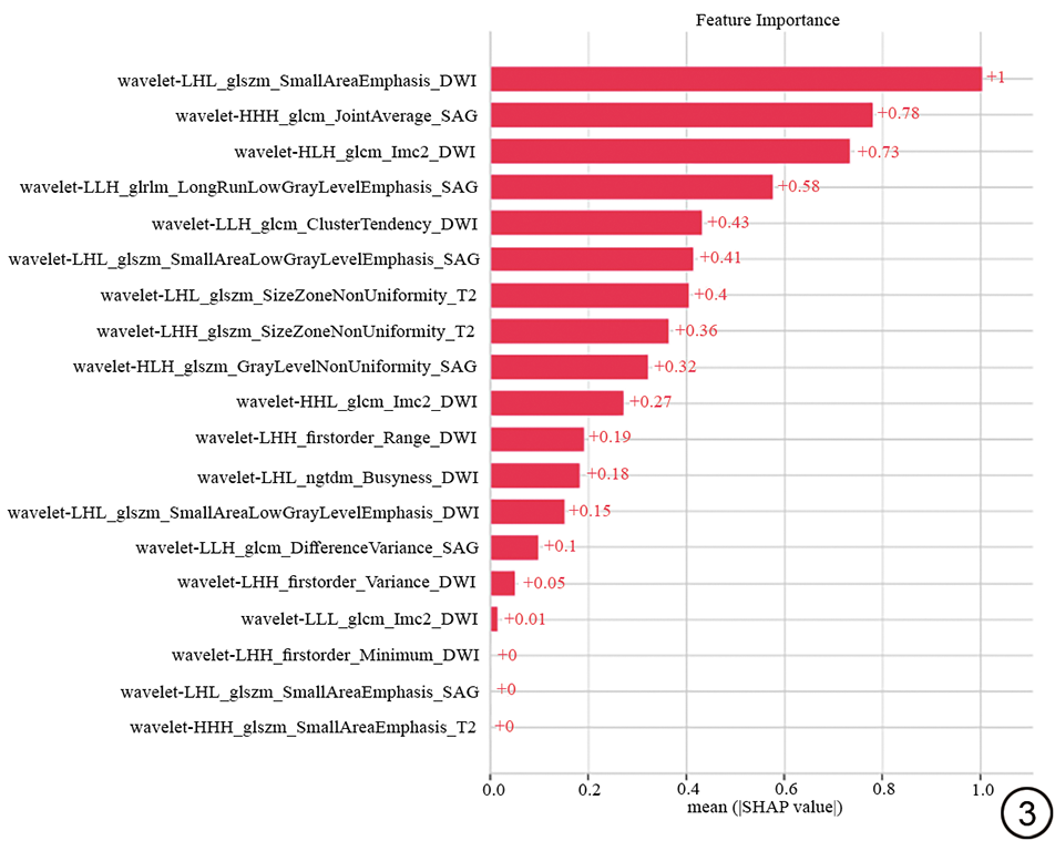 近年来,支持向量机和极限梯度提升(eXtreme gradient boosting, XGBoost)等复杂模型被应用于疗效预测,并展示出良好的性能[37, 38],然而,这些模型的“黑箱”性质限制了他们的可解释性及在临床场景中的应用。Shapley算法由于其可评估特征的贡献度及对模型的影响方向,已广泛应用于影像组学研究中。在本研究中,Shapley汇总图显示,DWI序列中的“wavelet-LHL_glszm_SmallAreaEmphasis”特征具有最高的Shapley分布区间,其Shapley值越高越倾向GR,反之越倾向PR,其次是CE-T1WI序列中的“wavelet-HHH_glcm_JointAverage”特征,主要反映肿瘤纹理特征的一致性和均匀性,这些特征与肿瘤的异质性相关,与nCRT疗效存在显著相关性。