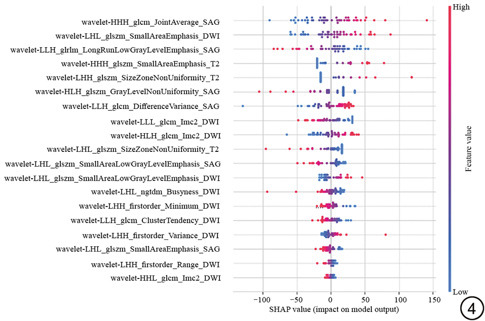 在本研究中,多模态影像组学模型在训练集、内部验证集、外部验证集的LARC疗效预测性能均优于单模态影像组学模型,因此本研究使用Shapley算法评估各影像组学特征对多模态模型预测结果的贡献程度,计算各影像组学特征的Shapley值并对其进行重要性排序,进而对多模态影像组学模型全局可解释性进行分析。Shapley特征贡献度排序图(图3)描述了各影像组学特征在预测nCRT患者疗效在全局水平的贡献程度。Shapley汇总图(图4)中,Shapley值越高(红色)表明越倾向于疗效好,反之,Shapley值越低(蓝色)则越倾向于疗效差。由结果可知,DWI序列中的“wavelet-LHL_glszm_SmallAreaEmphasis”是预测GR最重要的特征。