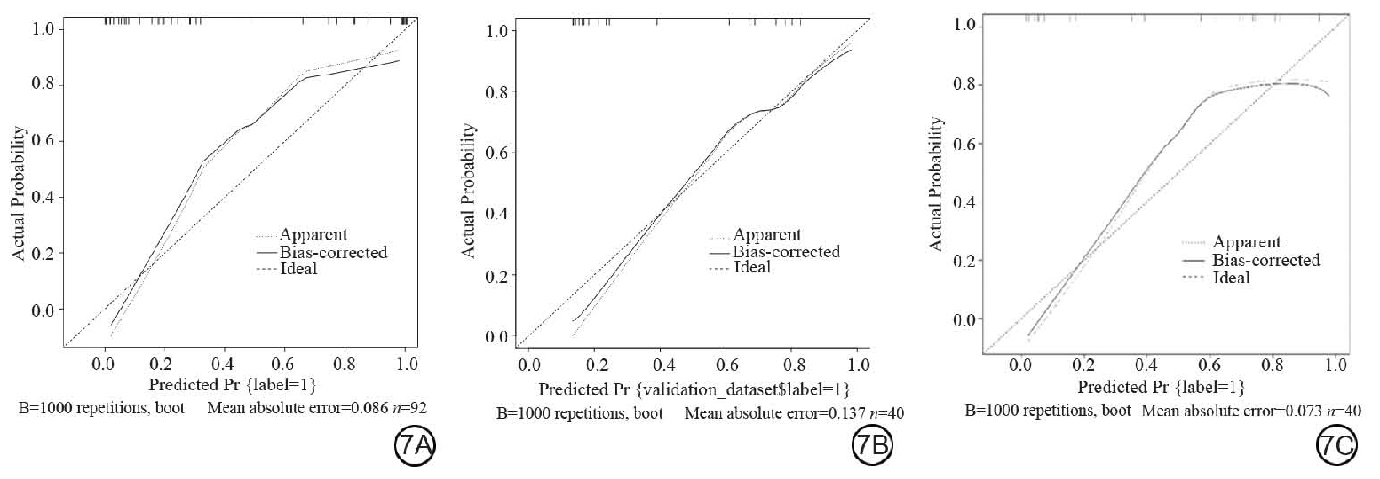 图7  列线图模型预测新辅助放化疗疗效的校准曲线。7A:训练集;7B:内部验证集;7C:外部验证集。