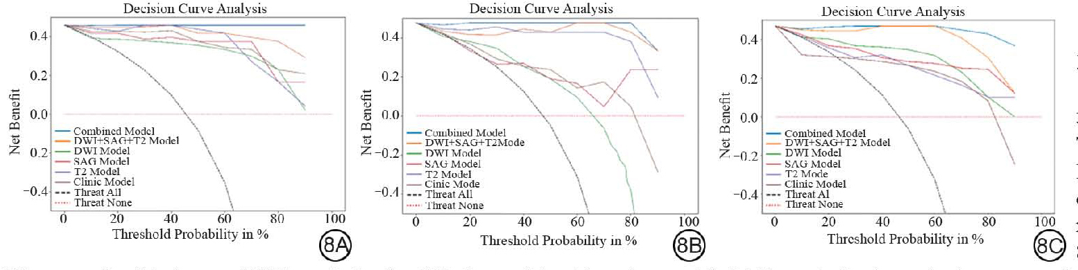 图8  不同模型预测新辅助放化疗疗效的决策曲线分析。8A:训练集;8B:内部验证集;8C:外部验证集。DWI 表示弥散加权成像模型;SAG表示矢状位对比增强T1WI(CE-T1WI)模型;T2 表示T2WI 模型。
