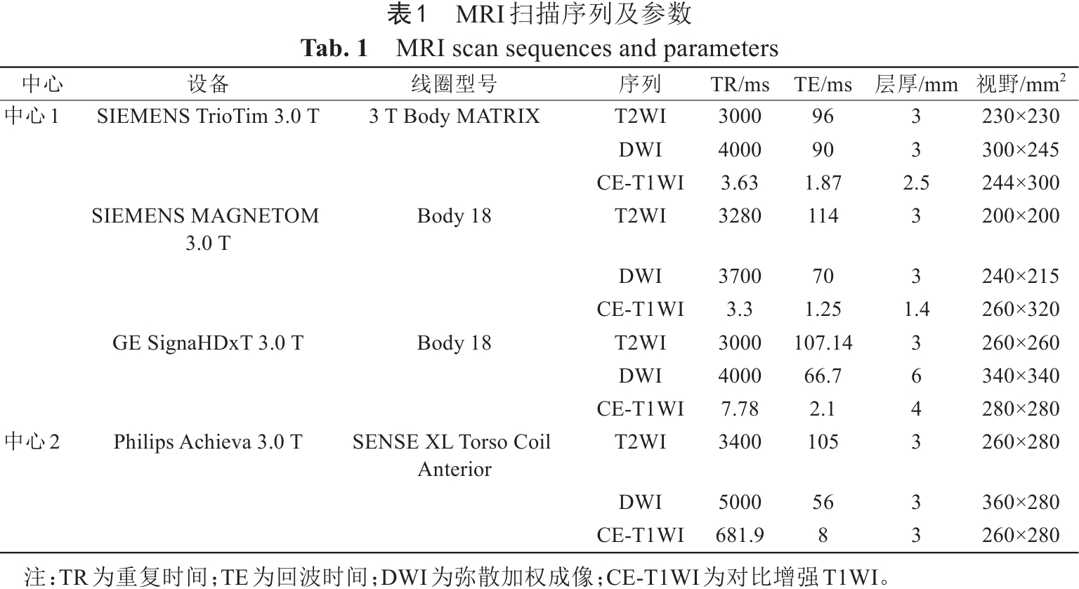 MRI检查使用3.0 T MRI扫描仪及8通道体部线圈完成,扫描方法符合直肠癌MR扫描专家共识[20],扫描序列包括高分辨率轴位T2加权成像(T2-weighted imaging, T2WI)、轴位弥散加权成像(diffusion-weighted imaging, DWI)(b=800 s/mm2)、矢状位对比增强T1加权成像(contrast-enhanced T1-weighted imaging, CE-T1WI),具体扫描序列及参数见表1。对比剂采用Gd-DTPA(北京北陆药业股份有限公司),剂量0.2 mmol/kg,注射速率2 mL/s。
