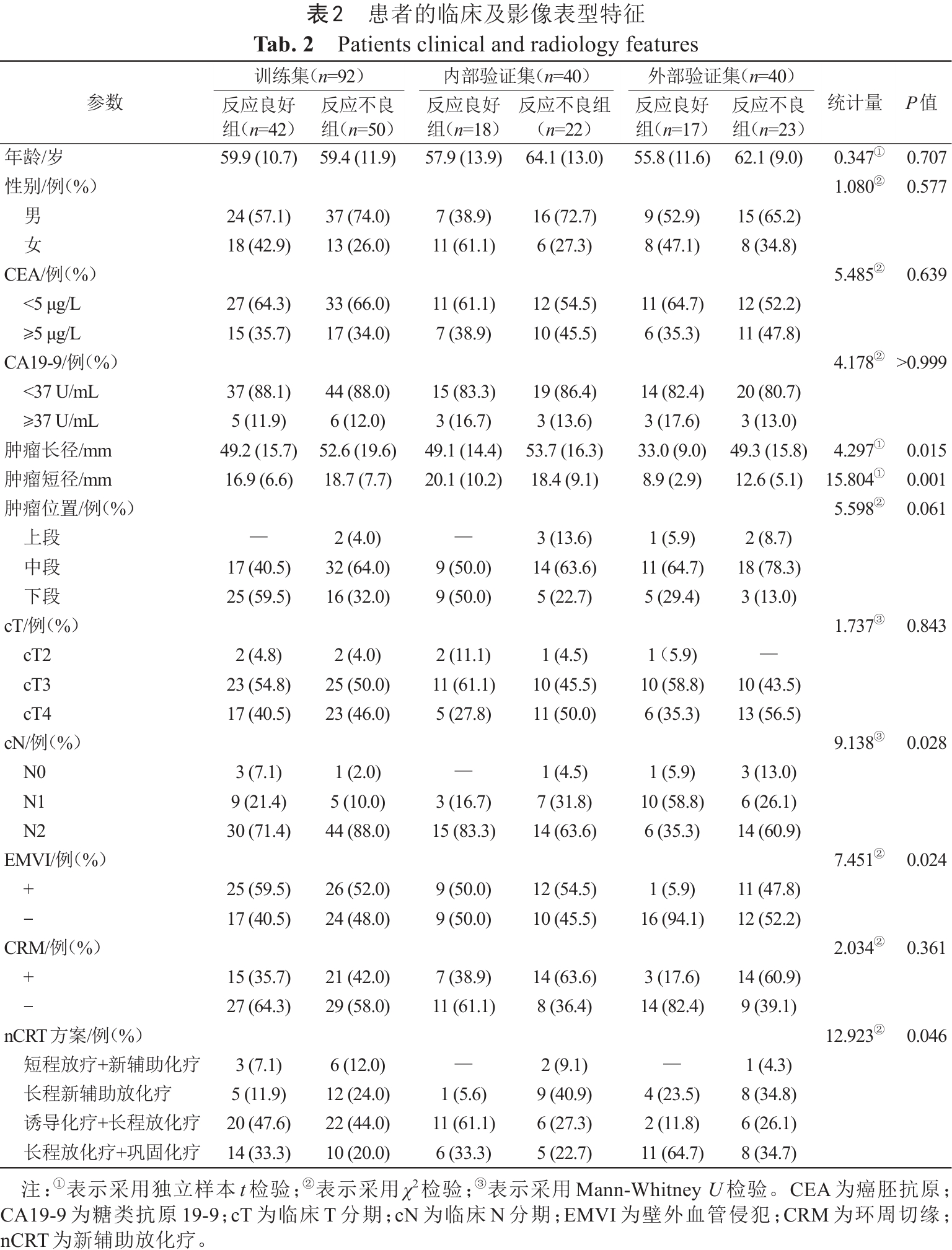 采用SPSS(版本26.0,美国IBM,https://www.ibm.com/products/spss-statistics)及Python(版本3.8,Python Software Foundation,https://www.python.org)软件进行数据分析及机器学习模型构建。计量资料(年龄、肿瘤长径、肿瘤短径)的正态性采用Shapiro-Wilk检验,符合正态分布者以均值±标准差表示,组间比较采用独立样本t检验(需满足Levene检验验证的方差齐性);不符合正态分布者以中位数(四分位数间距)表示,组间比较采用Mann-Whitney U检验。计数资料(如性别、CEA、CA19-9、肿瘤位置、CRM、EMVI、nCRT方式)以频数(百分比)表示,组间比较采用χ2检验。等级资料(如T分期、N分期)采用Mann-Whitney U检验进行比较。CEA和CA19-9的缺失率分别为2.5%、2.5%。采用众数插补(mode imputation)方法对缺失数据进行了处理。采用组内相关系数(intra-class correlation coefficients, ICCs)对两位医生分割的ROI进行观察者间一致性检验,ICC值>0.8表明病灶勾画一致性良好。ROC曲线用于评估模型预测疗效的性能,使用R语言中的pROC包(版本1.18.0,瑞士洛桑大学医院,https://cran.r-project.org/package)进行DeLong检验以比较不同模型间AUC的差异,同时采用了FDR(False Discovery Rate)方法进行多重比较校正。Hosmer-Lemeshow检验用于评估列线图模型的预测概率与实际观测概率之间的差异程度,P>0.05表示模型拟合良好。DCA设定的概率阈值范围为80%~100%,净获益的计算公式为:净获益=阳性真例数/总例数-阳性假例数/总例数×(患病阈值/1-患病阈值)。95% CI采用Bootstrap方法(1000次重抽样)进行计算。以P<0.05为差异具有统计学意义。