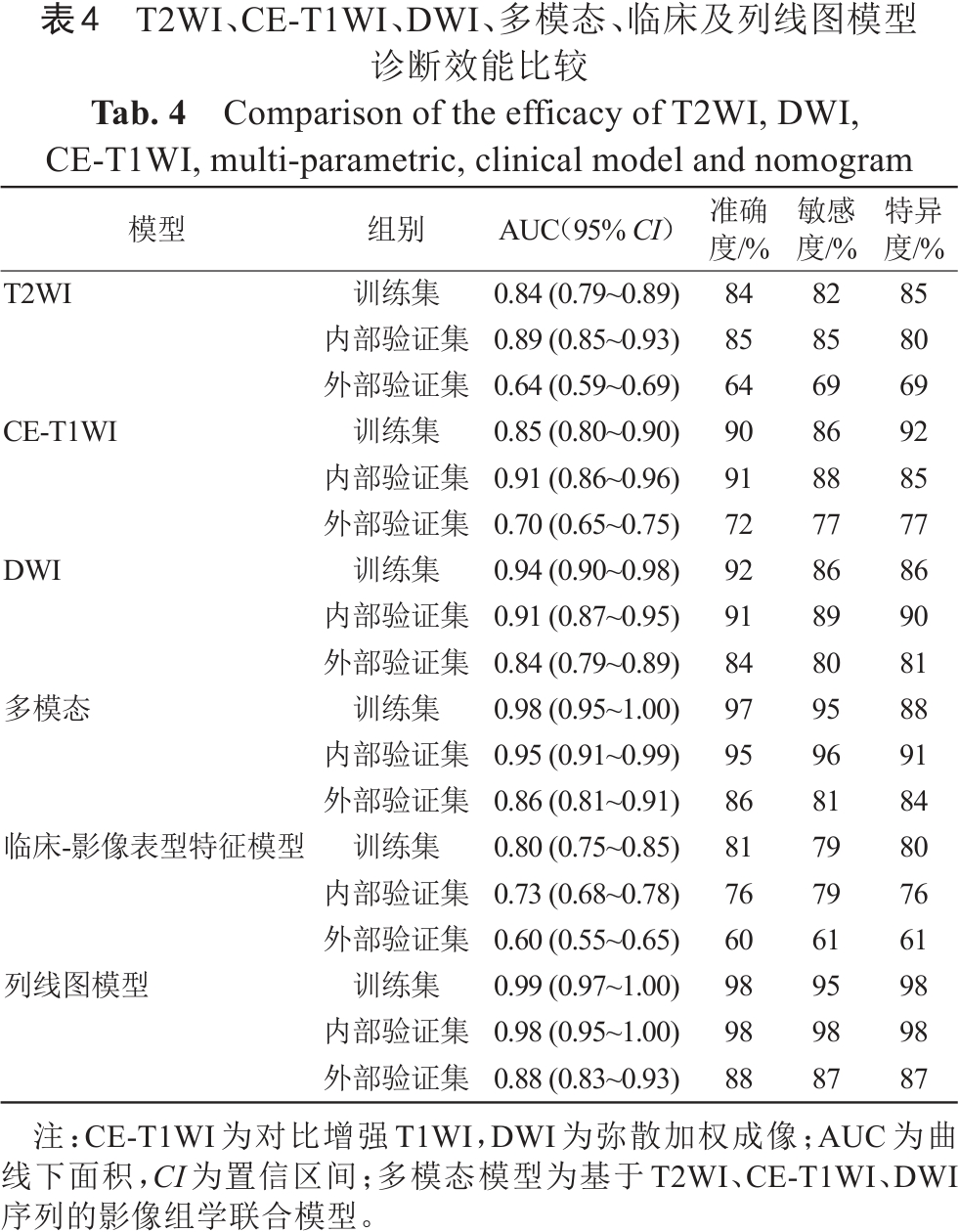 表4  T2WI、CE-T1WI、DWI、多模态、临床及列线图模型诊断效能比较