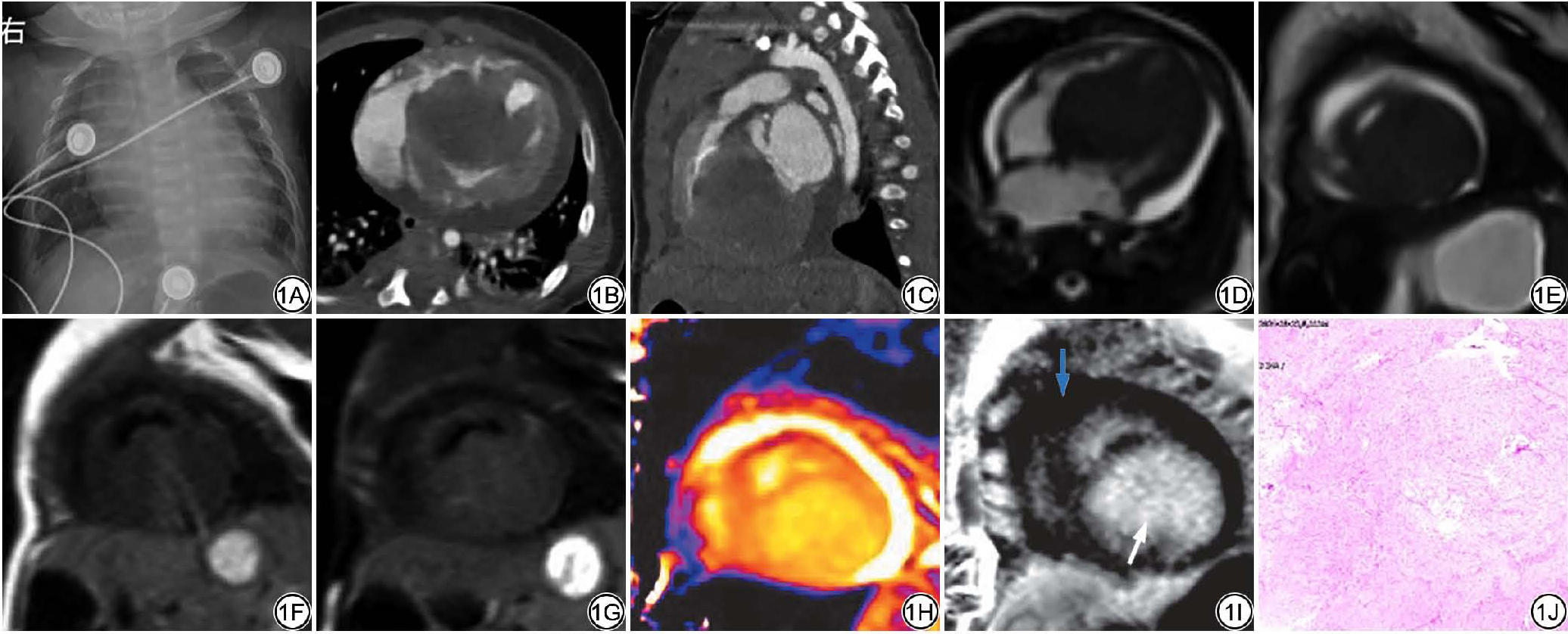 Fig. 1  Female, 2 months old, left ventricular cardiac fibroma. 1A: The chest X-ray shows a significant enlargement of the cardiac silhouette. 1B to 1C: Cardiac CT shows a solid mass in the left ventricle, with the basal attachment point suspected to be located at the upper half of the posterior interventricular septum, extending distally to the lateral wall of the left ventricle, apical segment, and apex; the left atrium is significantly enlarged. 1D to 1E: Cardiac MRI cine sequences in four-chamber and short-axis views show significant enlargement of the left atrium and left ventricle, with massive tumor-like masses in the left ventricular septum and inferior wall. 1F to 1G: Black-blood sequence T1WI shows the mass with isointense signal; fat-suppressed T2WI shows the mass with slightly hyperintense signal. 1H: T1 mapping sequence imaging shows that the native T1 mapping values are significantly prolonged (1703 to 1717 ms); 1I: Delayed enhancement PSIR sequence: The mass shows obvious homogeneous delayed enhancement, the interventricular septal myocardium is not involved and displays low signal, and no significant abnormal enhancement is observed (The white arrow indicates the lesion, and the blue arrow indicates normal myocardium). 1J: Pathological image (HE ×200) showing proliferative lesions of fibroblasts and myofibroblasts. The tumor cells are mild, and mitotic figures are not easily observed.