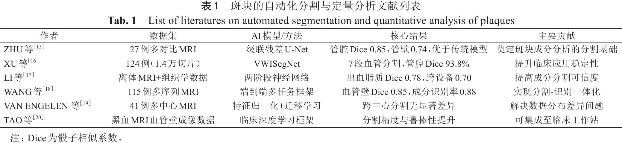 在传统MRI评估中,颈动脉易损斑块成分的定量分析常因人工勾画存在观察者间差异(约15%~20%)及三维结构连续性难以保持等问题,导致可重复性与精度受限[14]。近年来,DL技术为实现斑块成分的自动分割与定量评估提供了新途径。AI算法从监督学习到半监督学习再到无监督学习的推进,在降低数据标注成本的同时也为更大量数据的使用和泛化提供了途径。从临床应用的角度讲,出现一系列研究致力于开发高精度的管腔管壁自动分割及斑块识别模型,后续还进一步发展到对斑块成分的分割和识别,更深度地把技术能力嵌入到临床的治疗过程中,相关文献见表1