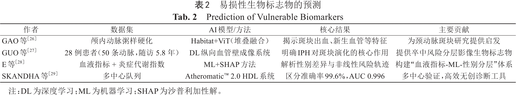 GAO等[26]通过提取纹理特征并筛选关键影像组学特征,在T1和T1增强两个序列上构建habitat模型;同时利用视觉变换器(vision transformer, ViT)的自注意力机制分析斑块跨区域的长程依赖关系。最终通过堆叠融合策略整合两种模型,形成Habitat+ViT联合模型。模型的可解释性分析揭示了斑块内出血和新生血管化等关键病理特征,与斑块不稳定的生物学机制一致。虽然该研究是针对颅内动脉粥样硬化,但是颅内和颈动脉斑块的易损生物标志物在病理机制、类型和临床应用上存在广泛关联,共同为动脉粥样硬化性脑血管疾病的风险评估和精准治疗提供了分子层面的依据,给颈动脉斑块的易损性生物标志物的研究提供了很多启发。GUO等[27]的研究聚焦于颈动脉IPH作为易损性生物标志物的预测价值,在扩散加权成像、磁敏感加权成像、T2-液体衰减反转恢复三个序列上通过DL驱动的纵向血管壁成像系统评估IPH对斑块负荷的长期影响。该研究纳入28例无症状颈动脉粥样硬化患者(共50条动脉),平均随访5.8年并完成4.7次多对比扫描,构建了创新的DL分析框架。该研究通过DL驱动的纵向分析,首次系统揭示了IPH在颈动脉斑块长期演化中的核心作用,为基于影像生物标志物的卒中风险分层提供了重要依据。