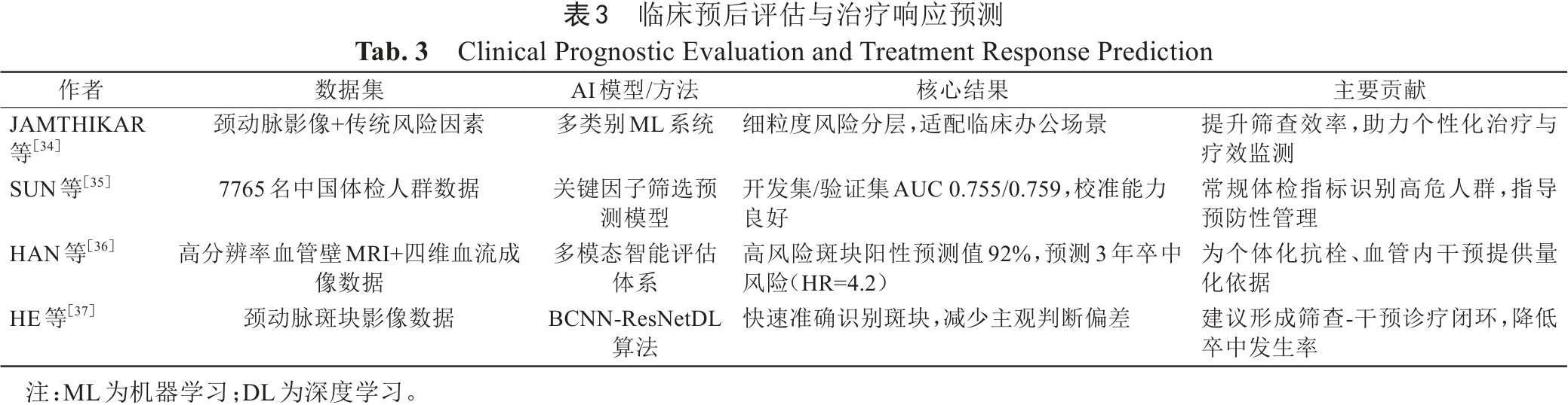JAMTHIKAR等[34]在评估基于颈动脉超声成像的多类别ML系统在心血管疾病/卒中风险预测中的价值,并以冠状动脉造影评分作为金标准,与传统心血管风险计算器进行对比。该研究纳入了500名参与者,结合传统风险因素和颈动脉斑块影像表型(如最大斑块高度、总斑块面积和斑块内新生血管)进行多类别风险分层。系统可为个性化治疗提供更细粒度的风险评估,有助于早期干预和药物疗效监测,其自动化架构适用于临床办公场景,仅需离线训练系数即可快速输出风险等级,提升了筛查效率。SUN等[35]开发并验证了一个用于预测早期中年人群颈动脉粥样硬化短期进展风险的模型。研究基于7765名中国体检人群数据,通过多种统计方法筛选出年龄、舒张压、尿酸、高密度脂蛋白胆固醇和低密度脂蛋白胆固醇五个关键预测因子。该模型在开发集和验证集中均表现出良好的区分度(AUC分别为0.755和0.759)和校准能力。该模型能早期识别颈动脉斑块进展的高危人群,为心脑血管疾病的预防性管理提供重要工具。通过常规体检指标即可实现风险分层,有助于针对性开展超声随访和干预措施(如他汀类药物治疗),对延缓动脉粥样硬化进展、降低心肌梗死和脑卒中风险具有重要价值。此外,HAN等[36]提出一种基于高分辨率血管壁MRI与四维血流成像的多模态智能评估体系,通过整合斑块形态学特征与血流动力学参数实现卒中风险精准预测。临床验证表明,该体系可精准识别高风险斑块(阳性预测值达92%),并预测3年内卒中发生风险(HR=4.2,95% CI:2.1~8.3),为个体化抗栓治疗时机选择及血管内干预决策提供量化依据。HE等[37]开发的BCNN-ResNetDL算法在临床治疗中具有重要应用价值。该算法能够快速、准确地识别颈动脉斑块的存在,为临床医生提供客观的诊断依据,减少因医生经验差异或疲劳导致的主观判断偏差。研究团队建议将该算法与现有心血管风险评估系统结合,形成从筛查到干预的完整诊疗闭环,最终降低由颈动脉病变引发的卒中发生率和医疗负担。
