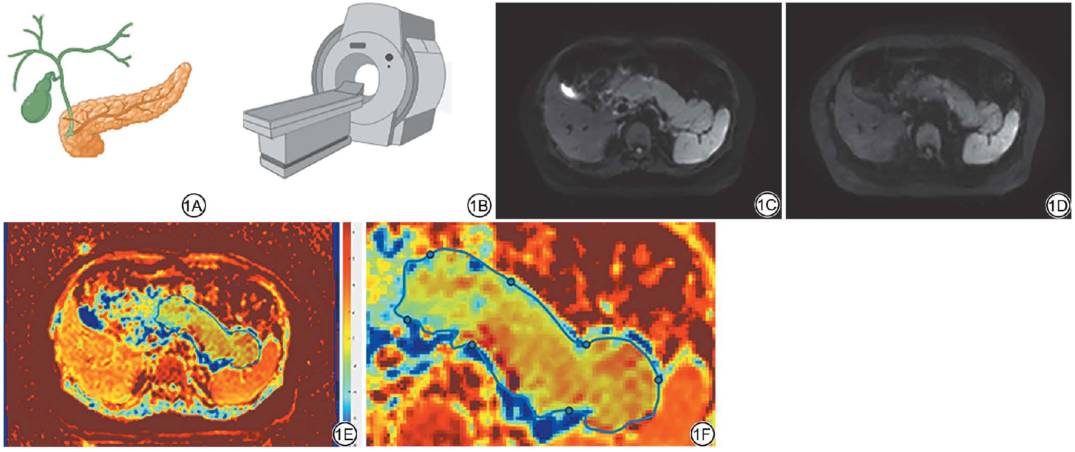 Fig. 1  Schematic illustration of diffusion-weighted imaging (DWI)-based virtual MR elastography (vMRE). 1A: The pancreas is shown as an example organ; 1B: schematic of MRI acquisition workflow; 1C: DWI at a low b-value (b = 200 s/mm²); 1D: DWI at a high b-value (b = 1500 s/mm²); 1E to 1F: The resulting μDiff stiffness map (kPa); the color bar indicates the stiffness range; the left panel shows the whole-map view and the right panel shows a zoomed-in view. In vMRE, a diffusion-related metric [e.g., sADC or ln (Slow/Shigh)] is converted to μDiff using a linear mapping: μDiff= α•sADC + β or μDiff= α•ln(Slow/Shigh) + β, where Slow and Shigh denote DWI signal intensities at low and high b-values, respectively. Parameters α and β are calibration constants (adopted from literature calibrated in the liver: α = -9.8, β = 14). DWI: diffusion-weighted imaging; vMRE: virtual magnetic resonance elastography; MRI: magnetic resonance imaging; sADC: shifted apparent diffusion coefficient; μDiff diffusion-derived virtual shear modulus (kPa); MRE: magnetic resonance elastography; Slow/Shigh: DWI signal intensities at low/high b-values.
