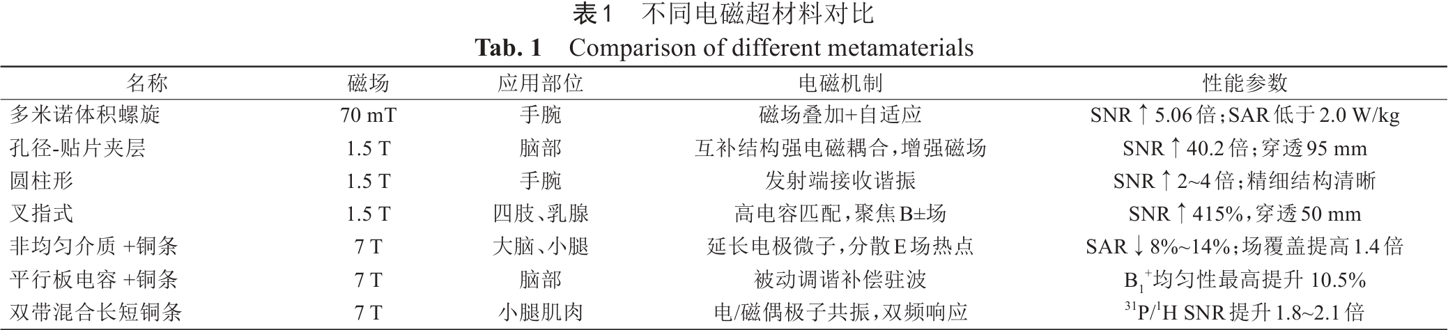 传统电磁超材料往往以ε和μ为核心指标,通过单元间的电磁互耦合作用,引发共振频率偏移,从而匹配拉莫尔频率,实现信号增强,进而实现高SNR的MRI[31]。比如,为提升70 mT极低场MRI的SNR,设计了多米诺体积超材料谐振器(domino volumetric metamaterial resonato, DVMR),利用单元间磁感应耦合延长能量传输路径,提升信号采集效率,适用于资源受限场景下的小关节结构成像,能清晰分辨腕骨细节[37]。在并行MRI(parallel MRI, pMRI)中,为解决加速扫描时相位编码减少导致的SNR下降,设计含变容二极管的非线性超材料。通过自适应响应,即在MRI接收阶段选择性增强射频磁场,传输阶段失谐规避干扰,结合表面线圈阵列,在健康志愿者小腿在体成像中实现3.3倍SNR提升[38]。该方法解决了传统pMRI中加速与SNR的矛盾,为甲状腺、颈动脉、颞下颌关节等浅表部位成像提供可行方案。近场耦合阵列双组件架构[39],能够满足从体表到半深部的多部位适配,且SNR提升、并行加速在不同部位可保持稳定。