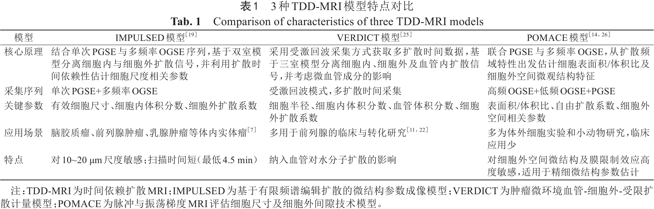 TDD-MRI 借助多隔室生物物理模型解析扩散信号,可实现对关键微结构参数的精准量化,常用模型主要包括基于受限扩散谱编译的微结构参数成像(imaging microstructural parameters using limited spectrally edited diffusion, IMPULSED)、肿瘤微环境血管-细胞外-受限扩散计量模型(vascular, extracellular and restricted diffusion for cytometry in tumors, VERDICT)和脉冲与振荡梯度MRI评估细胞尺寸及细胞外间隙技术模型(pulsed and oscillating gradient MRI for assessment of cell size and extracellular space, POMACE)[19]表1)。与常规DWI相比,TDD-MRI具有显著临床优势:无需对比剂,检查时间可控(≤15 min),参数稳定性高,适合重复检测。重要的是,研究表明TDD-MRI参数与特定分子标志物状态显著相关,如TDD-MRI参数可反映人类表皮生长因子受体2(human epidermal growth factor receptor 2, HER-2)过表达肿瘤常见的坏死结构特征,也可反映雌激素受体(estrogen receptor, ER)和孕激素受体(progesterone receptor, PR)阳性对应的细胞密度改变[20]。此外,TDD-MRI与IVIM技术联合应用,可进一步提高灌注参数稳定性,增强对血管生成与靶向治疗效果检测的敏感性[21]。作为一种新兴技术,TDD-MRI已在乳腺癌、脑胶质瘤、子宫内膜癌、卵巢癌及结直肠癌的分子标志物预测中展现一定应用价值[22, 23, 24]
