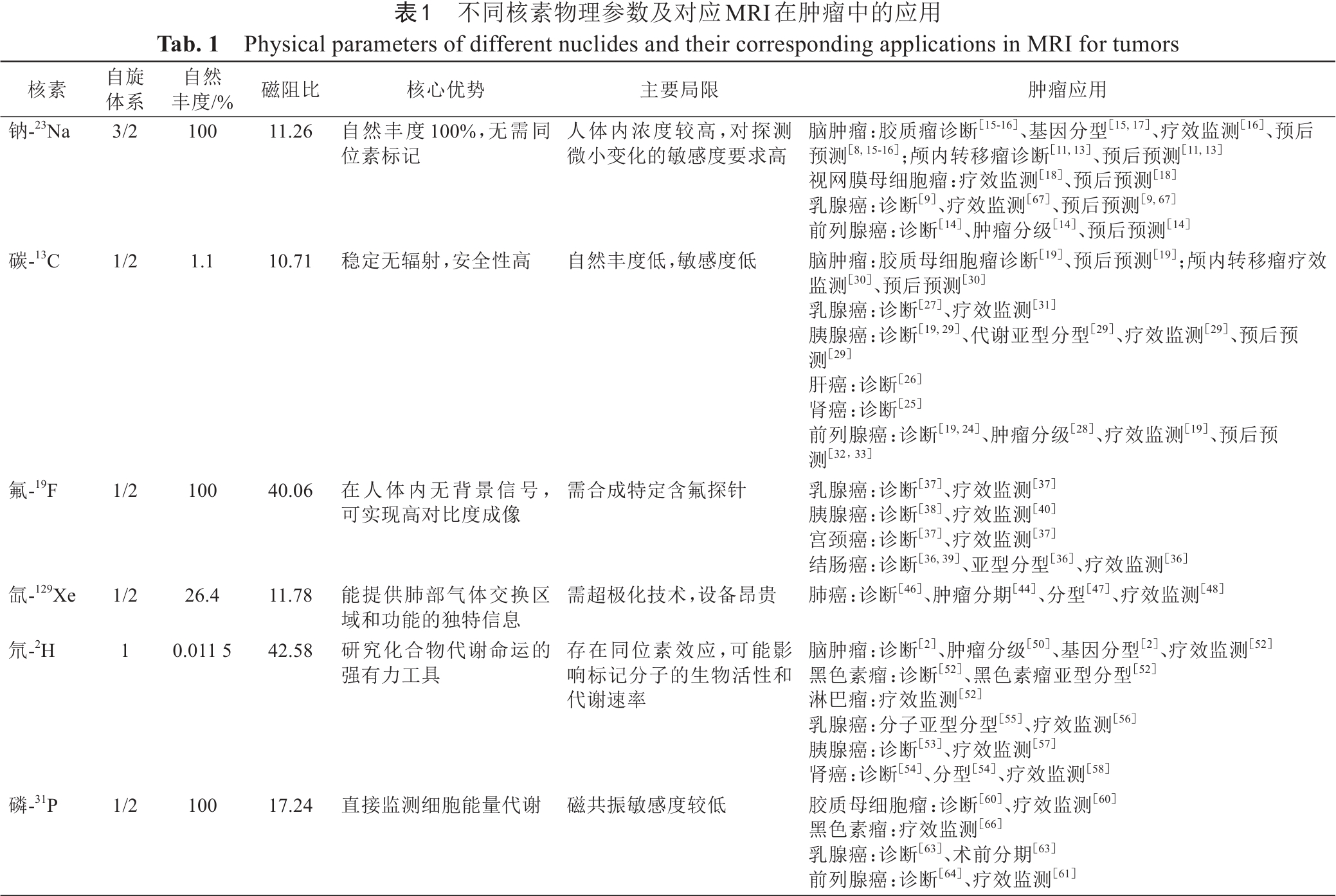 Tab. 1  Physical parameters of different nuclides and their corresponding applications in MRI for tumors