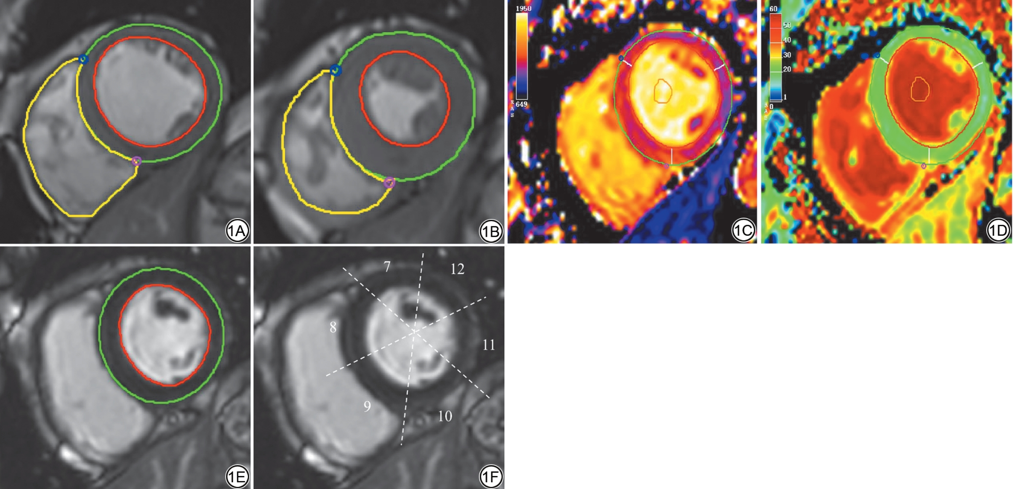 图1  心中部短轴位图像分析示意图。1A~1B:在舒张末期和收缩末期的电影图像勾画左心室心内外膜和右心室心内膜轮廓;1C~1D:在T1 mapping、ECV图像勾画左心室心内外膜和血池轮廓;1E:在LGE 图像勾画左心室心内外膜轮廓;1F:LGE 图像上左室心肌16 节段中第7~12 节段划分示意图。ECV:细胞外容积;LGE:延迟强化。