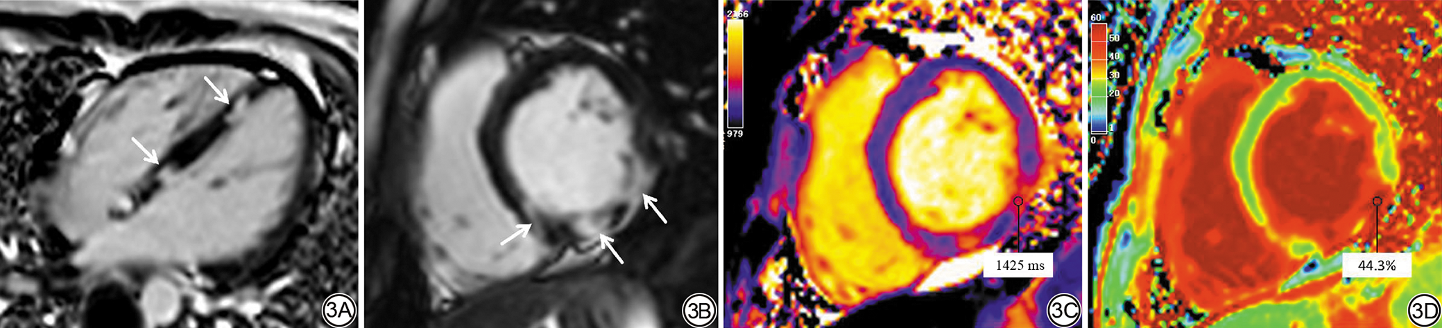 Fig. 3  Representative CMR from a SAPS patient (female, 18 years old). 3A to 3B: LGE shows multiple small patchy enhancements in the left ventricular inferoseptal, inferior, and inferolateral walls, several foci are in a non-coronary distribution (arrows). 3C: Native T1 mapping demonstrates corresponding regional elevation, with a peak value of 1425 ms in the inferolateral wall. 3D: ECV mapping shows a maximum of 44.3% in the inferolateral wall. CMR: cardiac magnetic resonance; SAPS: secondary antiphospholipid syndrome; LGE: late gadolinium enhancement; ECV: extracellular volume.