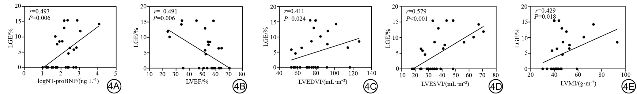 图4  LGE%与logNT-proBNP、LVEF、LVEDVI、LVESVI、LVMI的相关性。LGE:延迟强化;NT-proBNP:N末端B型利钠肽原;LVEF:左心室射血分数;LVEDVI:左心室舒张末期容积指数;LVESVI:左心室收缩末期容积指数;LVMI:左心室质量指数。