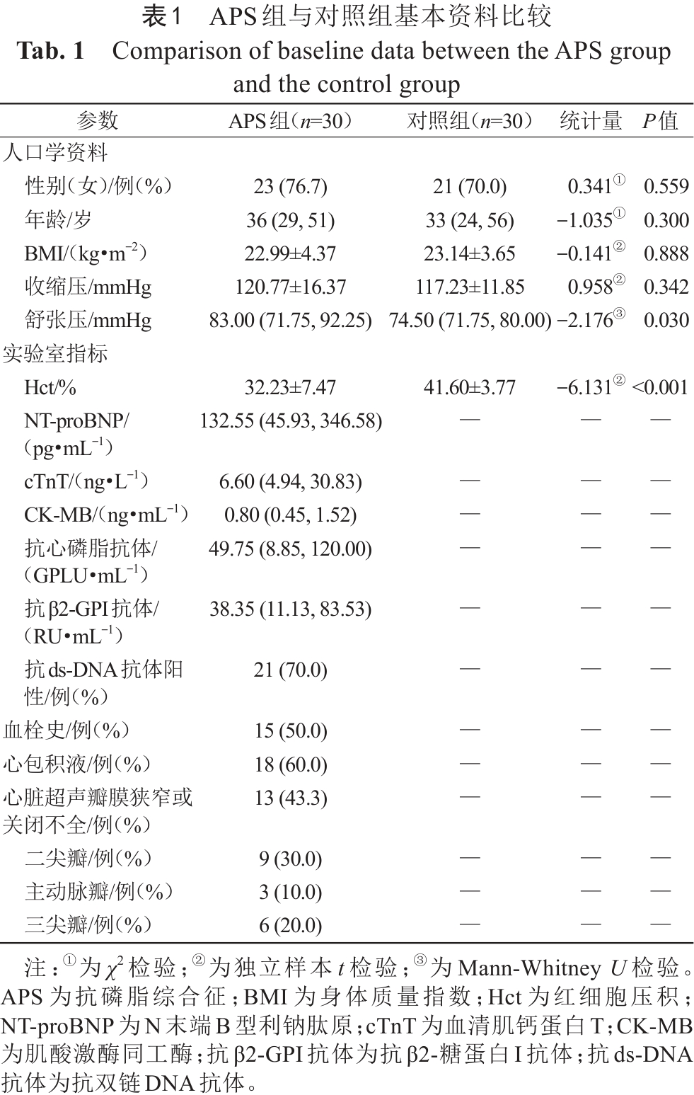 APS组和对照组的性别、年龄、身体质量指数(body mass index, BMI)差异均无统计学意义(P>0.05)。与对照组相比,APS组的舒张压较高[83.00 (71.75,92.25) mmHg vs. 74.50 (71.75,80.00) mmHg,P<0.05]、红细胞压积(hematocrit, Hct)较低(32.23%±7.47% vs. 41.60%±3.77%,P<0.05),实验室指标如NT-proBNP、抗磷脂抗体相关指标均高于正常参考值范围(表1)。