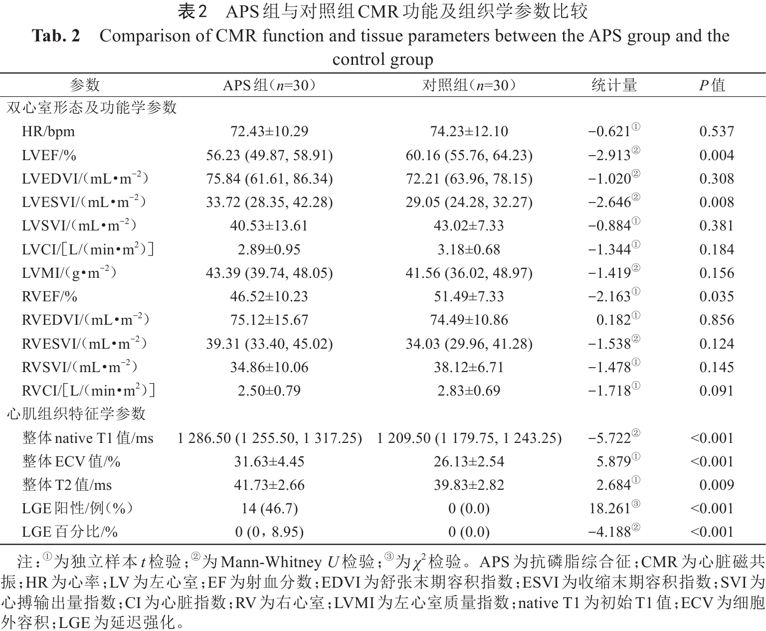Tab. 2  Comparison of CMR function and tissue parameters between the APS group and the control group