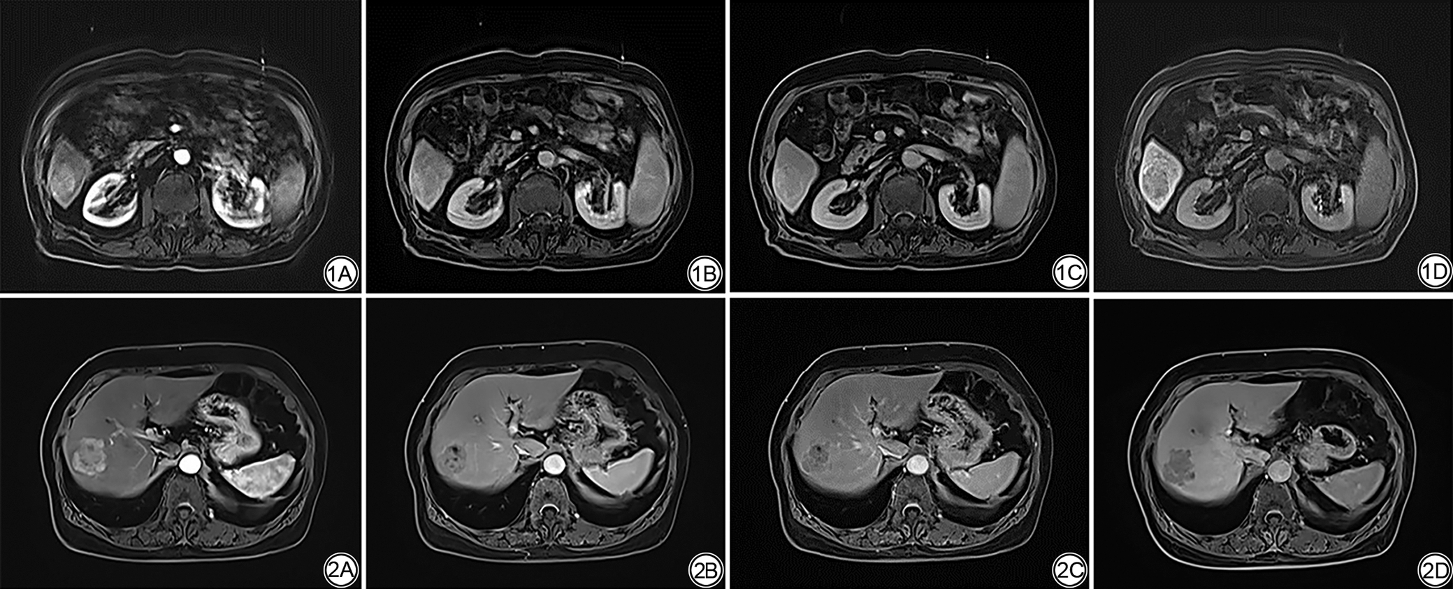 Fig. 1  Male, 83 years old, diagnosed with hepatocellular carcinoma, Child-Pugh class A. 1A-1D images respectively for gadoxetate disodium-enhanced MRI obtained in the arterial, portal venous, transitional, and hepatobiliary phases, the lesion image is affected by artifacts; however, the lesion still shows nonrim arterial phase hyperenhancement, in the portal venous phase, partial attenuation of enhancement is observed without a typical nonperipheral washout appearance, the lesion shows marked hypointensity in the hepatobiliary phase.