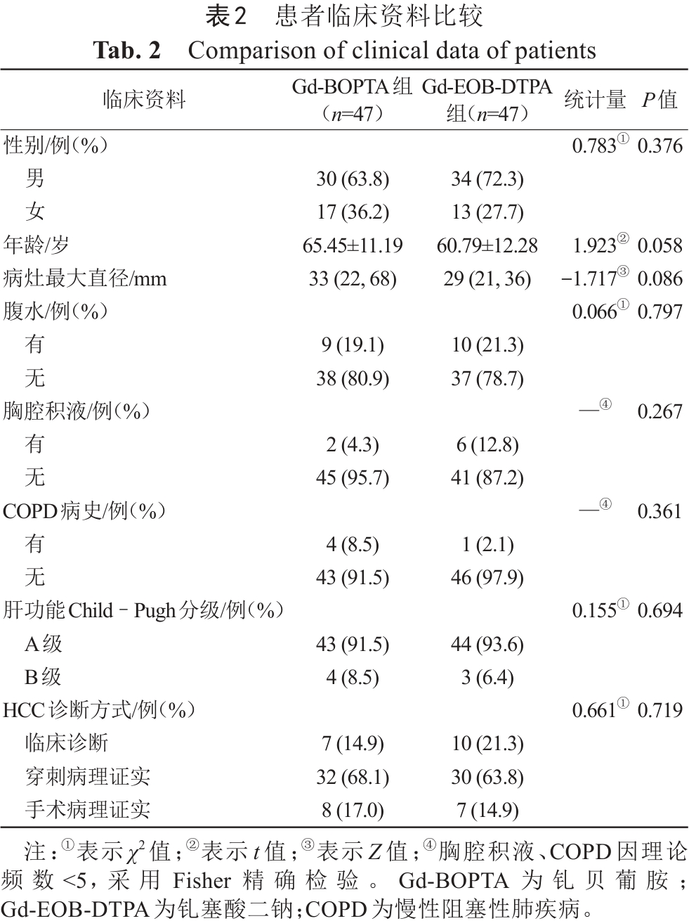 本研究共纳入HCC患者94例,其中Gd-EOB-DTPA组47例,Gd-BOPTA组47例。两组在性别、年龄、病灶最大径、腹水、胸腔积液、COPD、肝功能Child–Pugh分级以及HCC诊断方式等基线特征方面差异均无统计学意义(P>0.05)。两组患者的一般临床资料比较结果详见表2