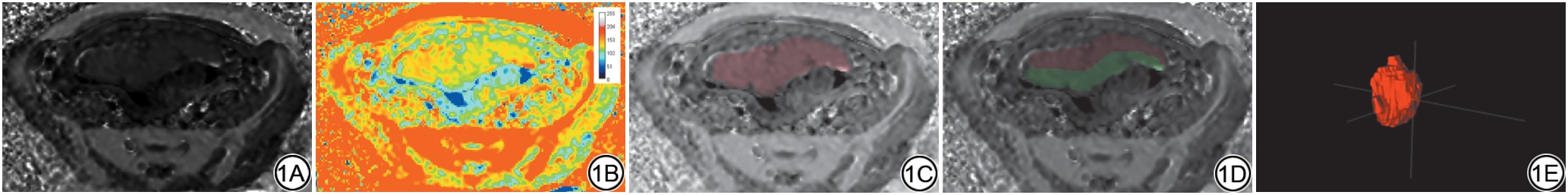 图1  胎盘虚拟剪切模量图像及感兴趣区勾画示意图。1A:胎盘轴位虚拟剪切模量(μdiff)原始图;1B:胎盘轴位虚拟剪切模量(μdiff)伪彩图;1C:整体胎盘轴位勾画区域(红色区域);1D:胎盘母体-胎儿侧轴位勾画区域(红色区域表示母体侧,绿色区域表示胎儿侧);1E:整个胎盘三维感兴趣区。