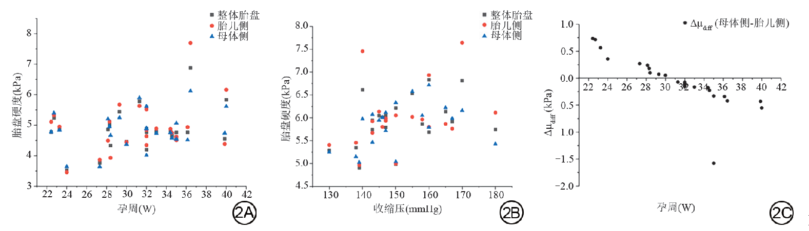 图2  正常孕妇和PIH胎盘各部位硬度与孕周、收缩压的关系。2A:正常孕妇胎盘各部位硬度值与孕周的关系;2B:PIH 孕妇胎盘各部位硬度值与母体收缩压的关系;2C:正常孕妇胎盘母体侧-胎儿侧的硬度值与孕周的关系。1 mmHg=0.133 kPa。PIH:妊娠高血压综合征;μdiff:平均虚拟剪切模量。