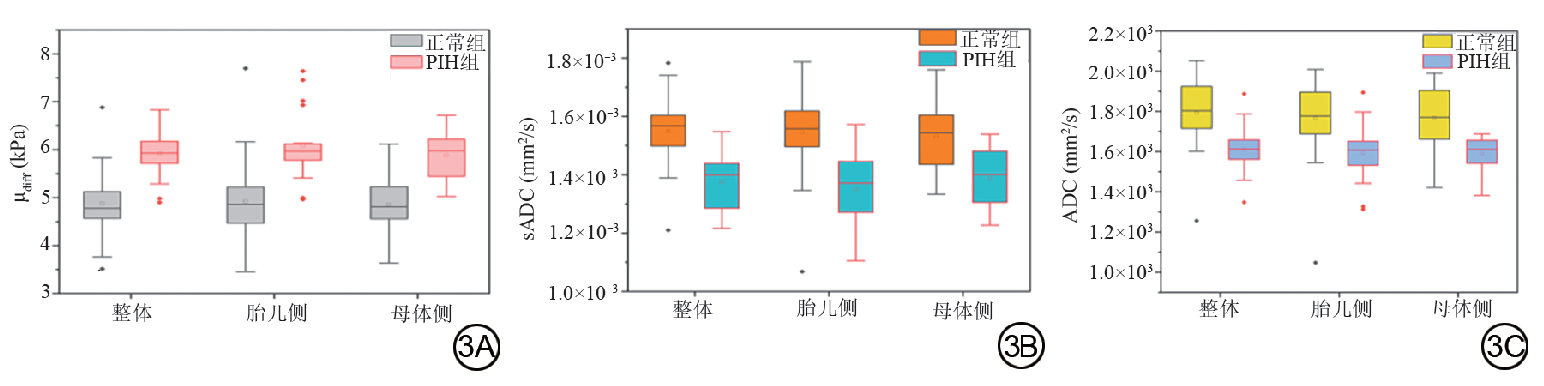 图3  两组胎盘不同部位硬度值μdiff(3A)、sADC(3B)、ADC(3C)的箱式图。μdiff:虚拟剪切模量;sADC:移位表观扩散系数;ADC:表观扩散系数。