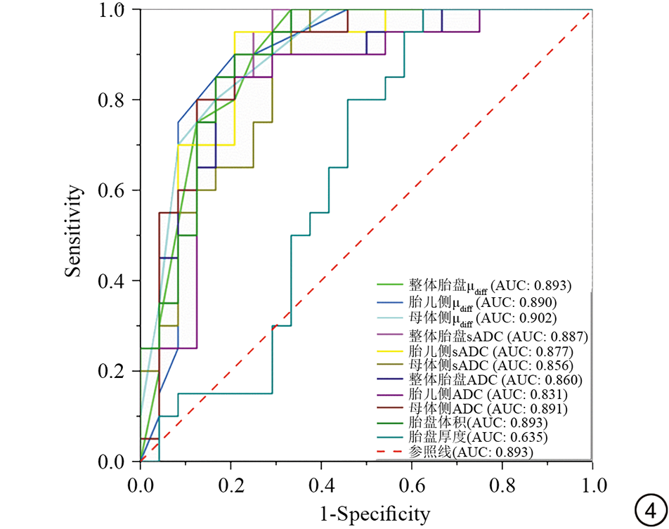 图4  胎盘各参数的受试者工作特征曲线。μdiff为虚拟剪切模量;sADC为移位表观扩散系数;ADC为表观扩散系数;AUC:曲线下面积。