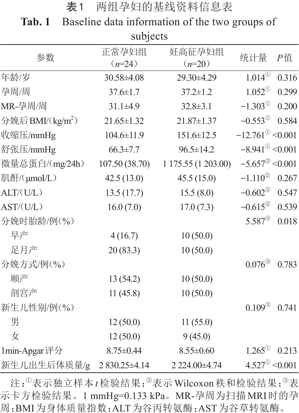 本研究最终纳入PIH孕妇20例(子痫前期6例,14例妊娠高血压),正常健康孕妇24例(19例孕晚期和5例孕中期),孕妇基线资料如表1所示。两组孕妇的年龄、孕周、MR-孕周、BMI、1min-Apgar评分、肌酐、ALT及AST的组间差异无统计学意义(P>0.05),而收缩压、舒张压、尿微量总蛋白、分娩时胎龄及新生儿出生后体质量的组间差异具有统计学意义(P<0.05)。