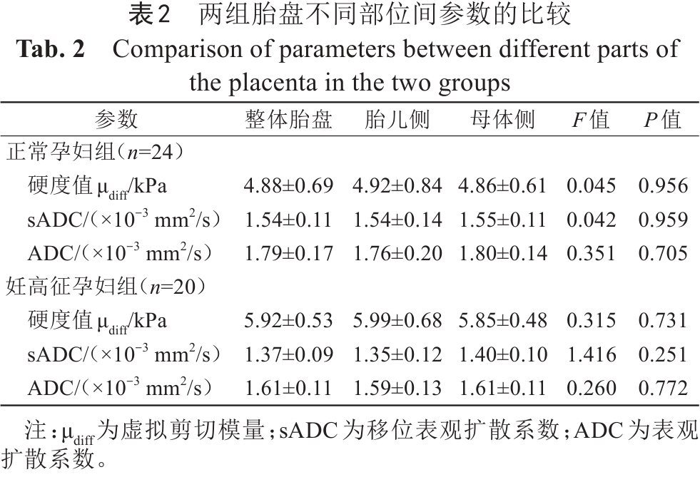 将IVIM-DWI图像传输到vMRE后处理软件(MATLAB R2016a, Math Works, Natick, Massachusetts, USA)进行分析。软件通过曲线拟合生成μdiff图和sADC图。首先,选择b值组合为200~800 s/mm2,计算sADC。S200和S800分别对应b值为200和800 s/mm2的图像信号。根据文献[11],sADC计算公式为:sADC=ln(S200/S800)/(800-200),然后,使用文献中推导的公式μdiff=α×sADC+β生成基于IVIM-DWI的胎盘μdiff图像。其中,αβ为先前研究得出的校准系数,分别为-9.8和14.0。