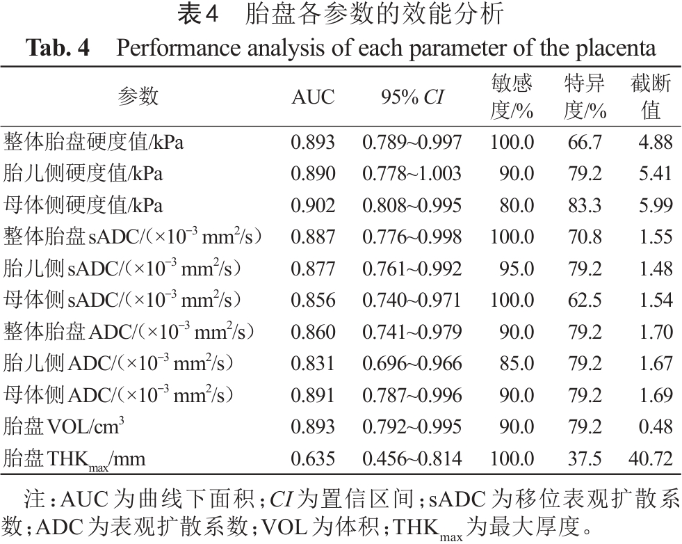 正常孕妇整体胎盘、胎盘胎儿侧、胎盘母体侧硬度值均低于PIH组(P<0.05);正常孕妇整体胎盘、胎盘胎儿侧、胎盘母体侧sADC、ADC均较高于PIH组(P<0.05)(图3);正常孕妇整体胎盘VOL、THKmax高于PIH组(P<0.05)(表3)。差异具有统计学意义参数的ROC曲线显示胎盘母体侧硬度值对PIH诊断效能较好,AUC=0.902(95% CI:0.808~0.995),胎盘母体侧硬度值的最佳截断值为5.99 kPa。胎盘形态学参数(胎盘VOL、THKmax)中,胎盘VOL对PIH胎盘诊断具有一定价值,AUC=0.893(95% CI:0.792~0.995)(表4图4)。
