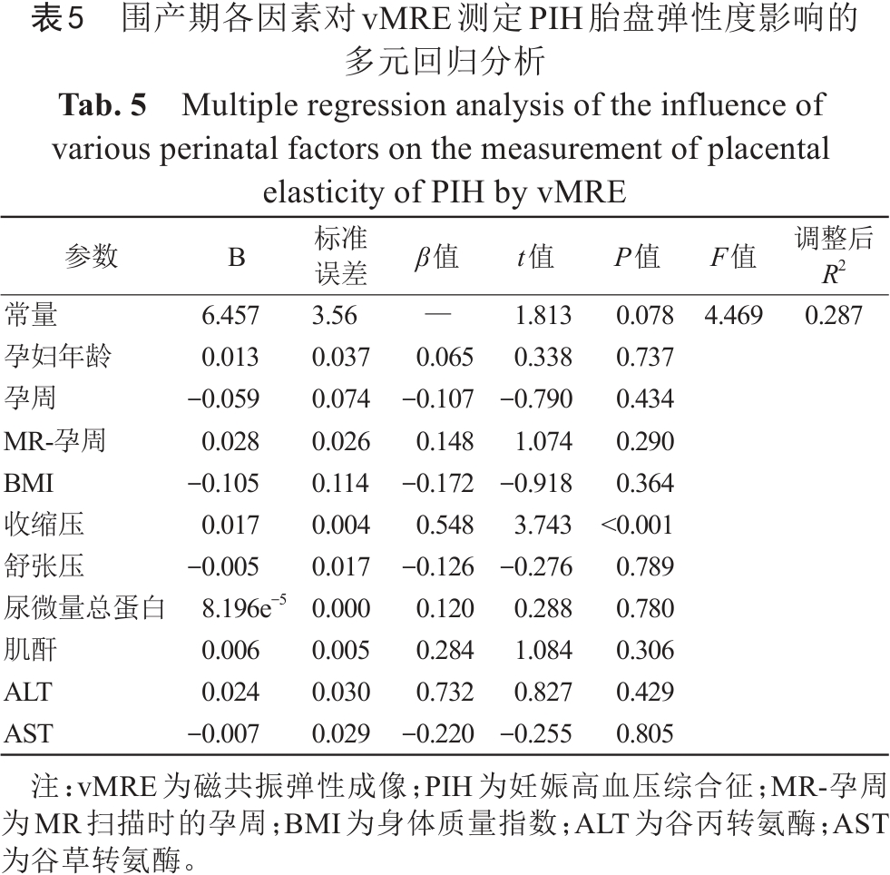 表5  围产期各因素对vMRE测定PIH胎盘弹性度影响的多元回归分析