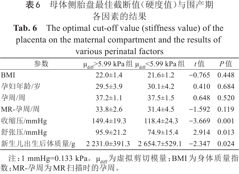 根据胎盘母体侧硬度值的最佳截断值5.99 kPa,将所有研究人群分为μdiff>5.99 kPa组与μdiff<5.99 kPa组,并评价两组围产期各因素间的差异。两组孕妇的BMI、年龄、孕周和MR-孕周差异均无统计学意义(P>0.05)。μdiff>5.99 kPa组比μdiff<5.99 kPa组的血压高(P<0.05),新生儿出生后体质量低(P=0.024),差异具有统计学意义(表6)。
