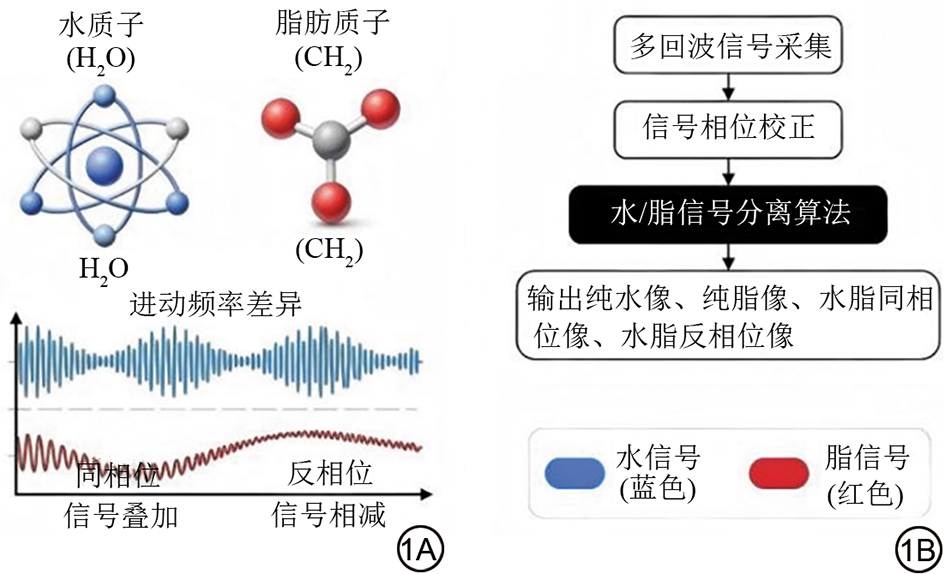 Fig. 1  Principles of magnetic resonance water-fat separation techniques. 1A: Principles of chemical shift imaging and gradient echo sequence; 1B: Multi-echo Dixon technique.