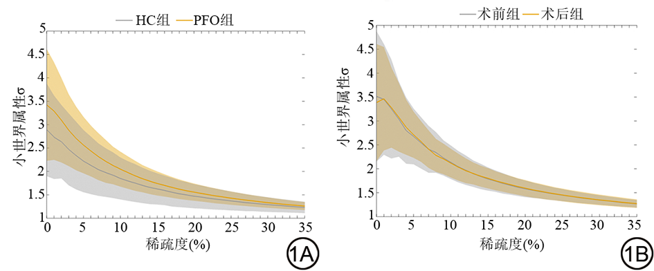 Fig. 1  Plot of statistical results of small-world attributes. 1A: Plot of statistical results of small-world attributes between PFO and HC groups. 1B: Plot of statistical results of small-world properties of the preoperative group and the postoperative group. The shaded area represents the area under the curve, indicating the intensity and stability of the small-world property of the brain network within different ranges of sparsity. The overlapping shaded areas represent the 95% confidence interval and the non-overlapping shaded areas indicate the regions where the small-world properties are significant. The yellow and gray lines represent the mean values of the small-world properties of the two groups at different sparsity levels. PFO: patent foramen ovale; HC: normal control.