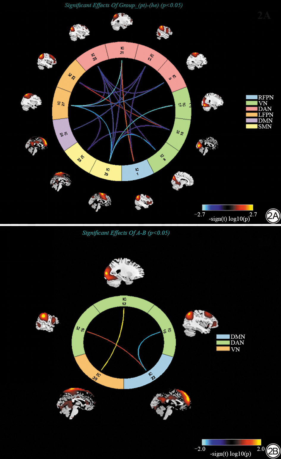 Fig. 2  Diagram of sFNC Changes. 2A: The changes of sFNC in the PFO group compared with the HC group. 2B: The changes in sFNC between the preoperative group and the postoperative group. PFO: patent foramen ovale; HC: healthy control; sFNC: dynamic functional connectivity.