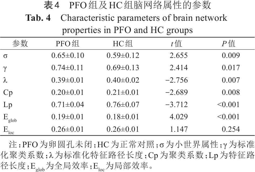 表4  PFO组及HC组脑网络属性的参数