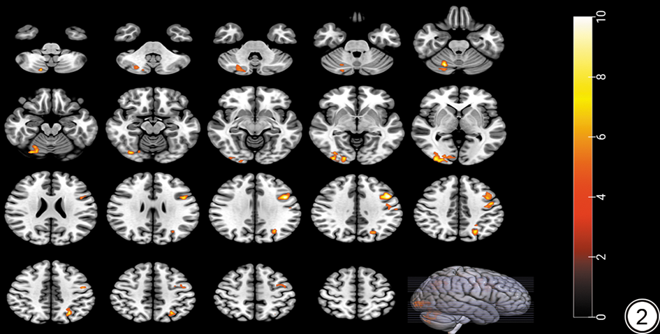 全脑高分辨率T1加权成像的结构像:在CAT12软件上,使用基于体素的形态测量学(voxel based morphometry, VBM)方法进行脑体积测量和分析,可得到灰质、白质等组织的体积信息。FC分析:使用基于种子点的功能连接分析方法,VBM分析中灰质体积差异有统计学意义的脑区定义为感兴趣脑区即种子点,分别计算其与全脑每个体素的连接,获取得到对应的功能连接值,进行fisher z变换,最终对zFC进行统计。
