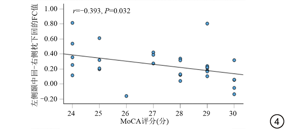 T2DM组左侧颞中回与右侧枕下回的FC值与MoCA评分呈负相关(r=-0.393,P=0.032),见图4