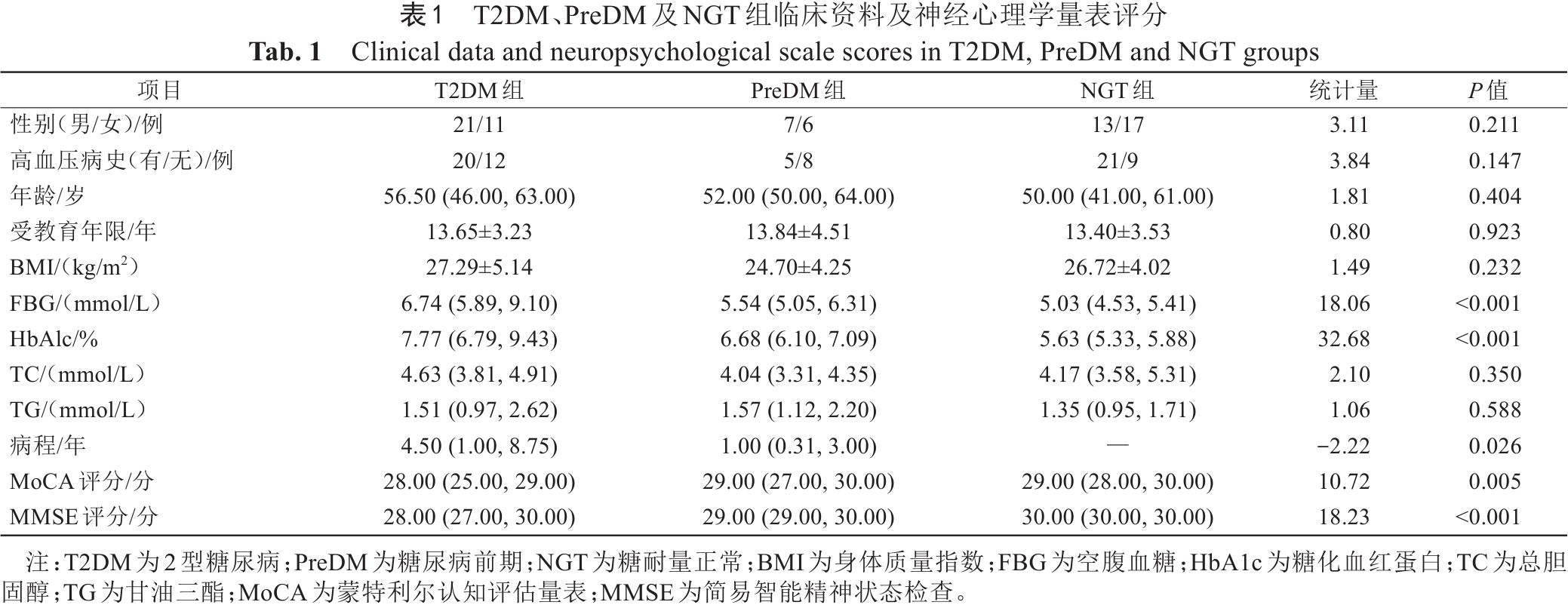 Tab. 1  Clinical data and neuropsychological scale scores in T2DM, PreDM and NGT groups