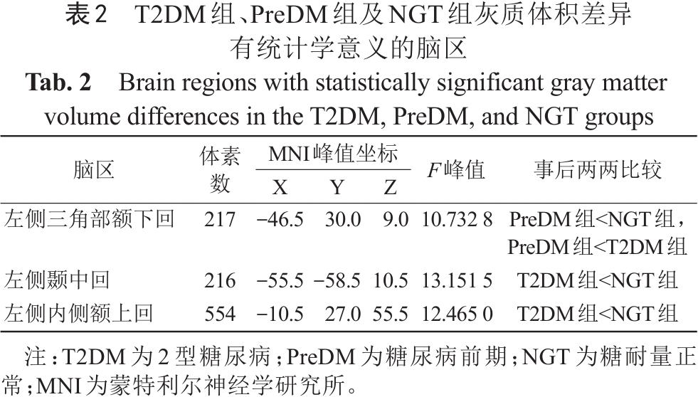 T2DM、PreDM、NGT三组间全脑灰质体积差异有统计学意义的脑区:左侧三角部额下回、左侧颞中回、左侧内侧额上回。事后分析结果显示:与NGT组对比,T2DM组左侧颞中回、左侧内侧额上回的灰质体积减小,PreDM组左侧三角部额下回的灰质体积减小;与PreDM组对比,T2DM组左侧三角部额下回的灰质体积增大。结果详见表2图1