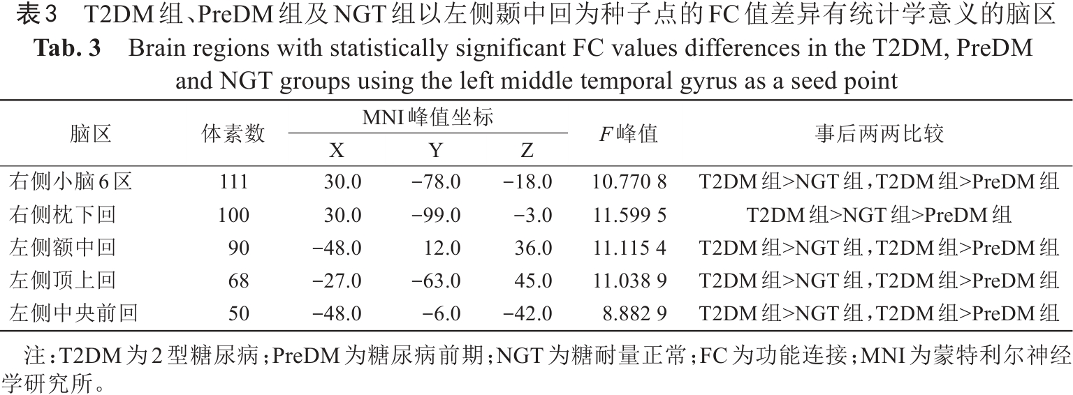 Tab. 3  Brain regions with statistically significant FC values differences in the T2DM, PreDM and NGT groups using the left middle temporal gyrus as a seed point