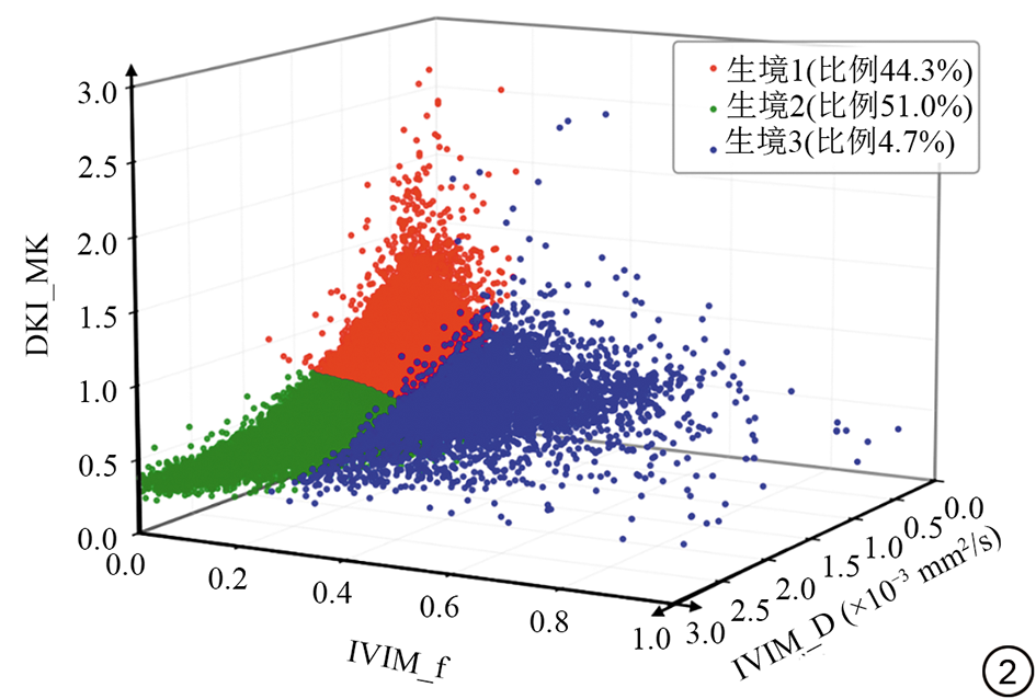 图2  基于IVIM_f,IVIM_D和DKI_MK的全体素聚类图。IVIM:体素内不相干运动模型;D:真实扩散系数;f:灌注分数;DKI:扩散峰度成像;MK:平均扩散峰度。